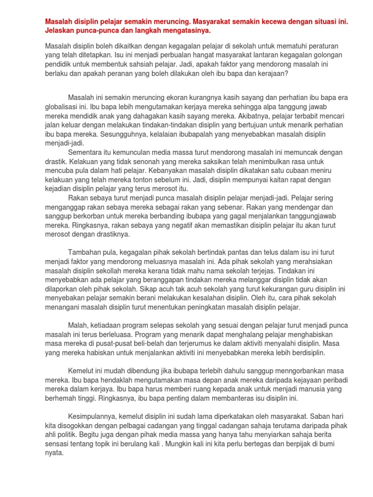 Apakah punca atau faktor yang mempengaruhi remaja sampai menimbulkan masalah. Malah rasa kasih sayang kepada ibu bapa juga hampir hilang Punca masalah disiplin tidak harus menunding jari menyalahkan sesama sendiri. Contoh Karangan Bahasa Malaysia SPM Masalah disiplin semakin berleluasa di sekolah.